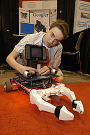 Intel ISEF finalist, George Hotz, 15, of Hackensack, New Jersey, shows off his project titled, "The Googler".