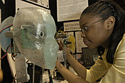 Intel ISEF finalist, Julie Loza, 15, of Kouts, Indiana, shows her project to Intel CEO Craig Barrett, titled, "Can Lasers Be Used to Measure Blood Glucose Levels?". |