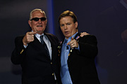 Intel CEO, Craig Barrett, and ISEF opening ceremony host, weather man, Mike Harvey of KPHO-TV, celebrate ISEF. |