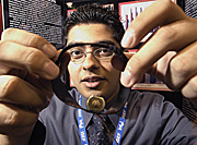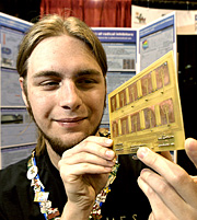 Intel ISEF finalist, Karl Plank, 17, of Bellingham, Washington, shows his project titled, "Toward Self-Assembling Nanocircuitry Using Liquid Crystal Solvents" to Intel CEO Craig Barrett.