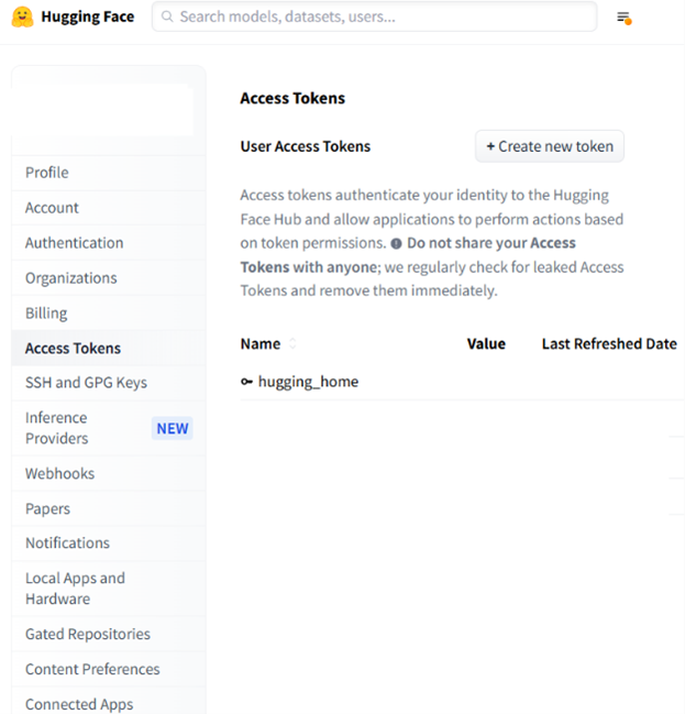 1. Open a Hugging Face* account. After you’ve opened your Hugging Face account, obtain an access token for it: