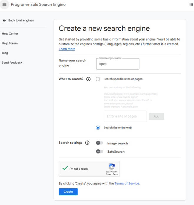 2. Create a Google Programmable Search Engine. Create a new Google Programmable Search Engine as shown below and take note of your search engine ID, preferably in a secrets manager. You’ll use this ID later in environment variables to configure your application.
