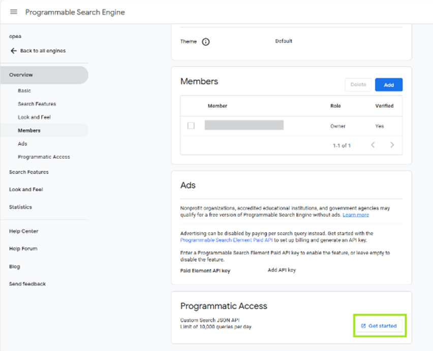 3. Obtain the Programmable Search Engine API key. Once you’ve created your new search engine, scroll to the bottom of the Overview page to the “Programmatic Access” section. Click “Get Started,” then “Get a Key.” Take note of the key as before; you’ll need it later.