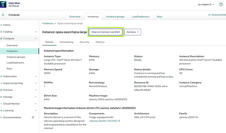 6. SSH into your machine and configure SearchQnA. To SSH into your new instance, you’ll see instructions when you view your instance on Intel® Tiber™ AI Cloud as shown in the figure below. Follow the instructions in your terminal.