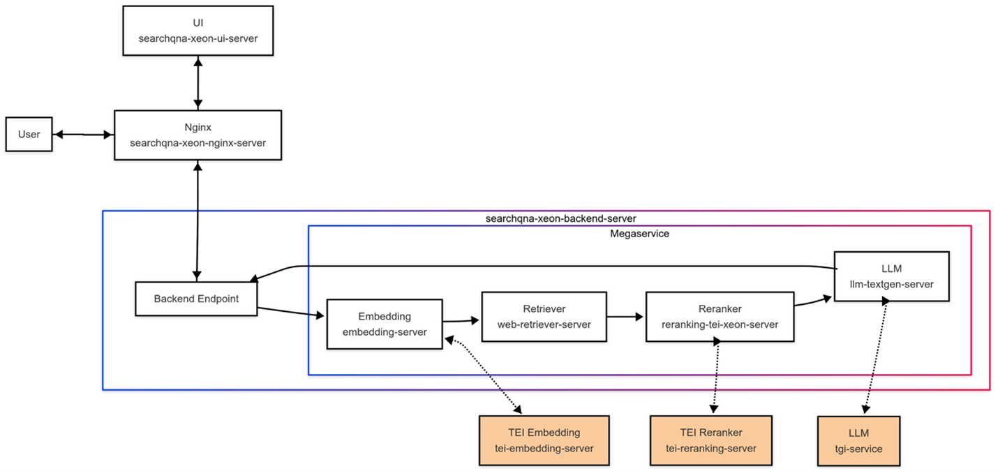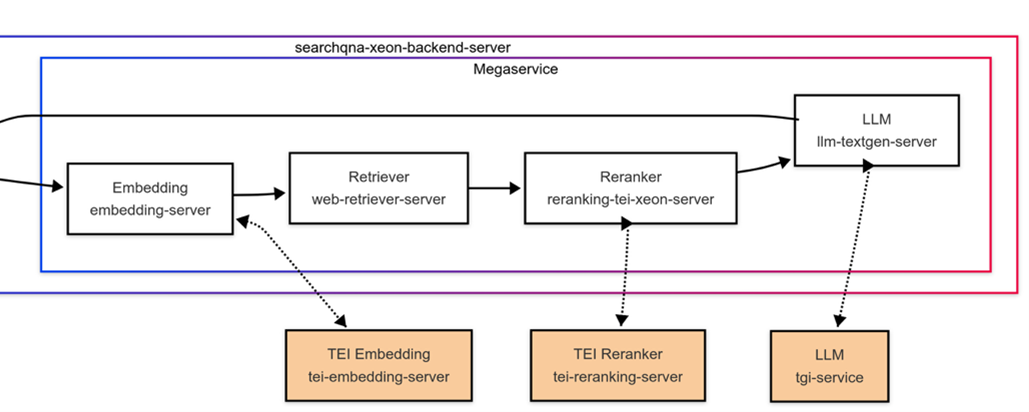 To process the request, the searchqna-xeon-backend-server orchestrates the sequence of calls defined in a “megaservice,” via a directed-acyclic-graph (DAG). The megaservice processes the query (embedding-server), retrieves relevant web results (web-retriever-server), reprioritizes the results (reranking-tei-xeon-server), and then finally invokes the LLM (llm-textgen-server) to generate a response back to the user in their browser.