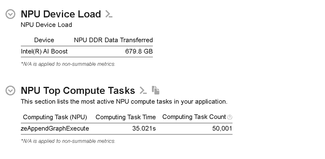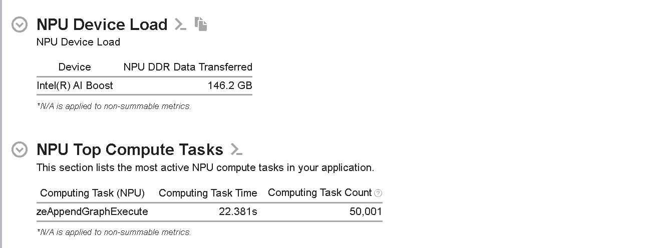 Also, a “NPU Top Compute Tasks” section lists the top computing tasks executing on the NPU side. In this example, zeAppendGraphExecute appends a graph execution command to the command list. These API calls take ~35s to execute any number of tasks, and the count is 50,001. In this context, a graph represents a sequence of operations that can be executed on the NPU.
