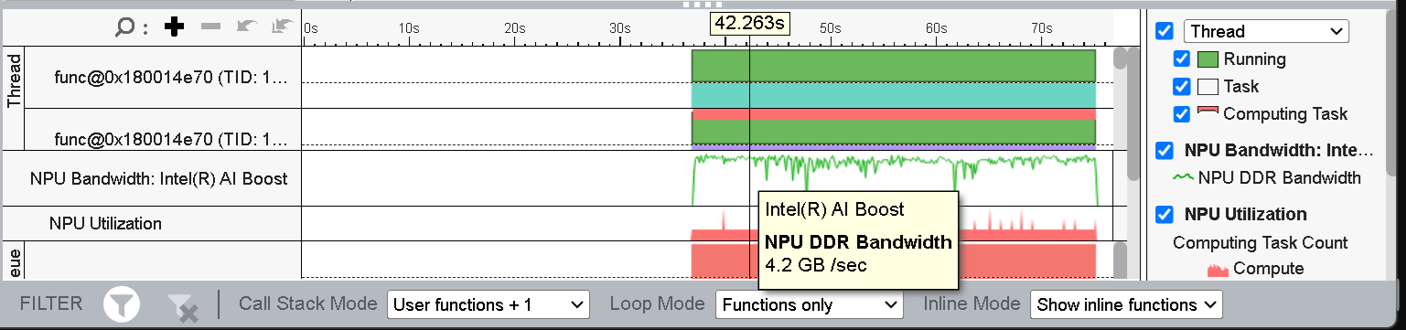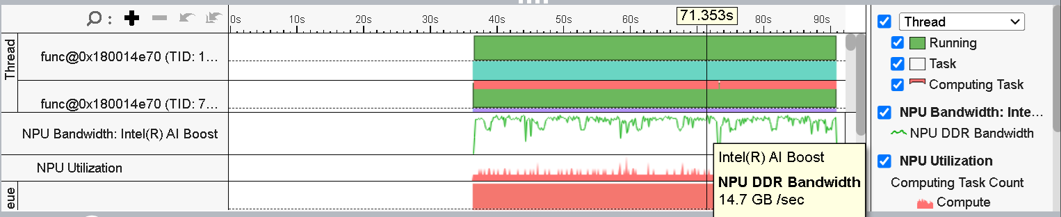 From the timeline view, we can also see the NPU DDR Bandwidth utilization throughout the execution time. The Figure 6 shows that the peak NPU DDR Bandwidth is ~14 GB/s.