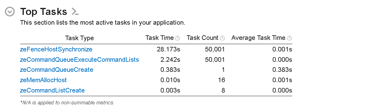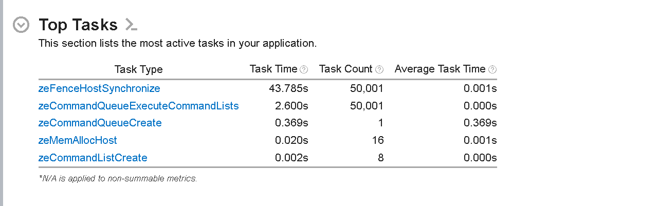 The ’Top Tasks’ section lists the most active tasks taking place on the host side execution of the application. This section helps identify which functions or code regions consume the most CPU time. The most time-consuming host tasks are zeFenceHostSynchronize API calls that take ~54s. These calls ensure the host waits until the fence is signaled or a specified timeout period expires. This list shows the total time taken by each task, the total task count, and the average time for each task.