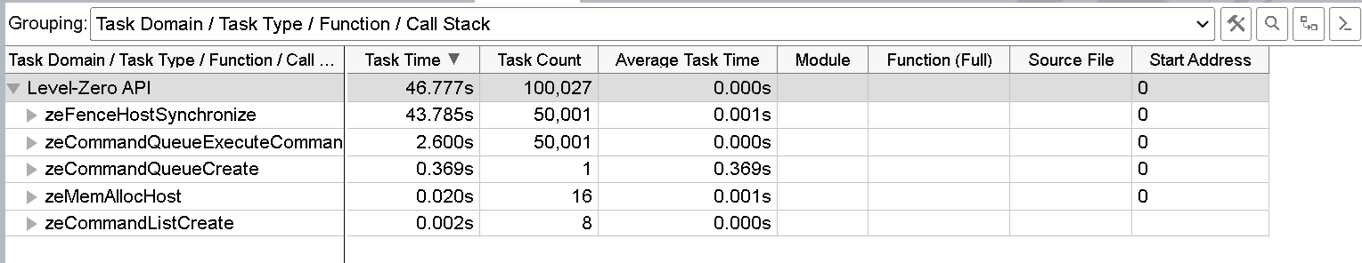 We can also see significant differences in the Top tasks on the host side. For example, the zeFenceHostSynchronize and zeCommandQueueExecuteCOmmandLists now take much less time compared to the unquantized implementation of the model.