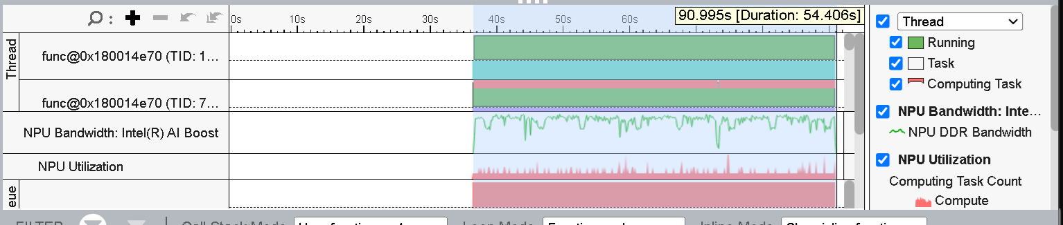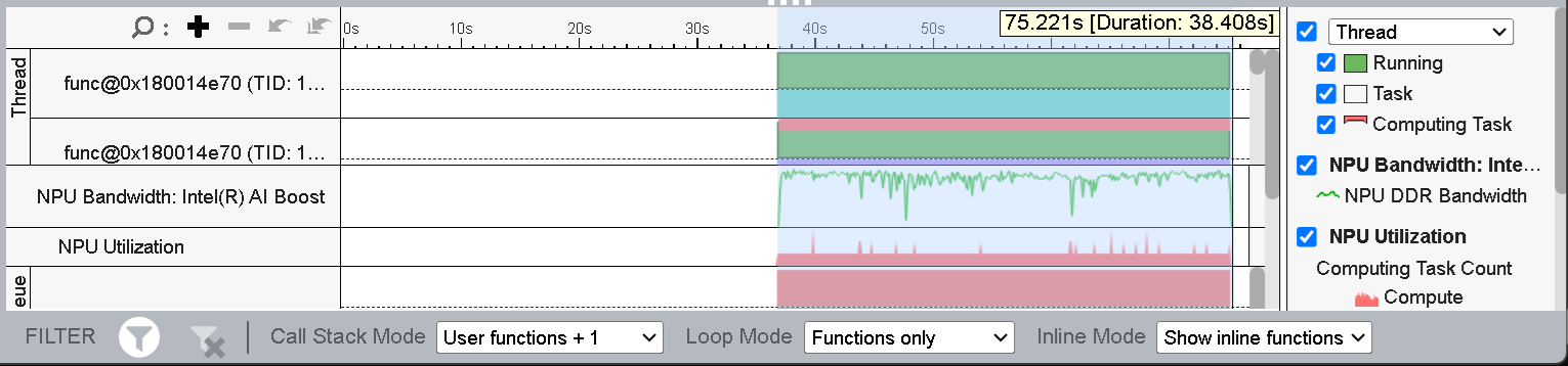 Figure 4 (timeline view) shows the list of threads running on the CPU and NPU. You can also see the corresponding NPU Utilization and NPU Bandwidth throughout the timeline. Here, we select the region where the NPU was active and can see the duration for inference is ~54s.