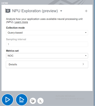 Currently, the only Metric Set Supported is NOC (Network-on-Chip) fabric. The NPU goes through this fabric to read/write data from/to DDR memory. The sampling Interval can also be set based on your workload and required profiling granularity. Other detailed options can be set from the “How pane” for more fine-grained control.