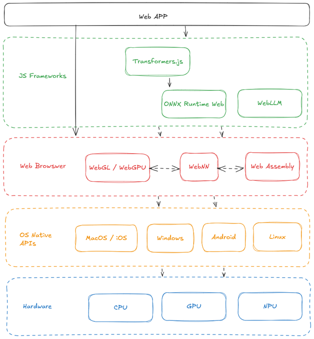 3. Browser APIs (WebGL/WebGPU/WebNN/WebAssembly): These technologies enable efficient hardware acceleration without requiring platform-specific code, ensuring compatibility across devices.