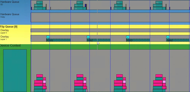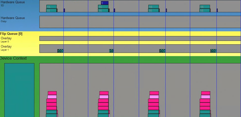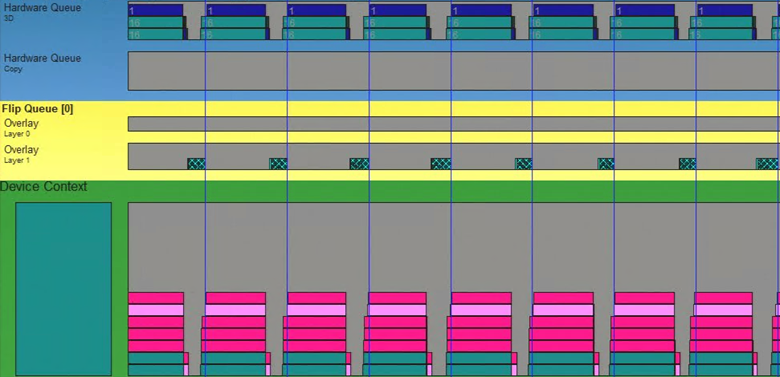The first is render queue reduction, which is always available. This optimization instructs the application to wait before CPU work for a next frame begins until a last possible moment, so that when command lists pertaining to the next frame are submitted to a GPU, it will not be queued, but its GPU processing will start almost immediately. This results in a decrease of input-to-render latency.