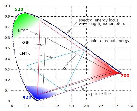 The chromaticity diagram exhibits that the gamut of any three fixed colors cannot enclose all visible colors. For example, Figure CIE xyY Chromaticity Diagram and Color Gamut shows schematically the gamut of reproducible colors for the RGB primaries of a typical color CRT monitor, CMYK color printing, and for the NTSC television.