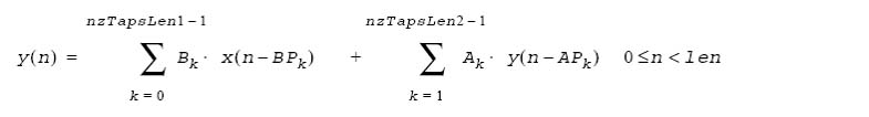 This function applies the sparse IIR filter to the len elements of the source vector pSrc, and stores the results in pDst. The filter parameters - the number of non-zero taps nzTapsLen1, nzTapsLen2, their values pNZTaps and their positions pNZTapPos, and the delay line values pDlyLine - are specified in the sparse IIR filter structure pState that should be previously initialized the function ippsIIRSparseInit.