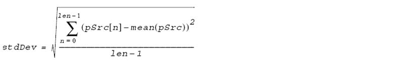 This function computes both the mean value and the standard deviation of the input vector pSrc, and stores the results in pMean and pStdDev respectively. The vector length can not be less than 2. The mean of pSrc is defined by the formula: