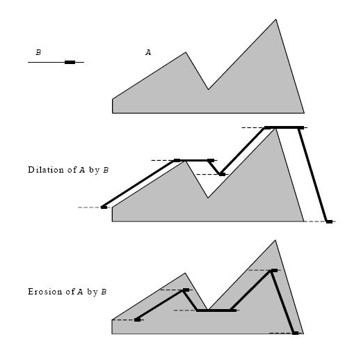 Erosion and dilation can be done in 3D space, that is, with gray levels. 3D structuring elements can be used, but the simplest and the best way is to use a flat structuring element B. Figure "1D Cross Section of Dilation and Erosion of A by B" is a 1D cross section of dilation and erosion of a grayscale image A by a flat structuring element B. In the figure, B has an anchor slightly to the right of the center as shown by the dark mark on B.