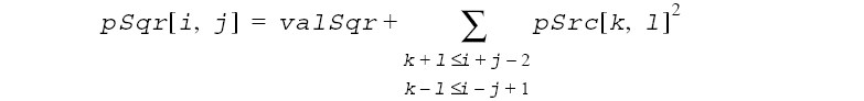 where i,j are coordinates of the destination image pixels (see Figure “Operation of the Integral and TiltedIntegral functions”) varying in the range i = 2 ,..., roiSize.height, j = 0,..., roiSize.width. Pixel values of zero and first rows (i=0,1) are set to val for pDst, and to valSqr for pSqr. The size of both destination images is (roiSize.width + 2) x (roiSize.height + 2).