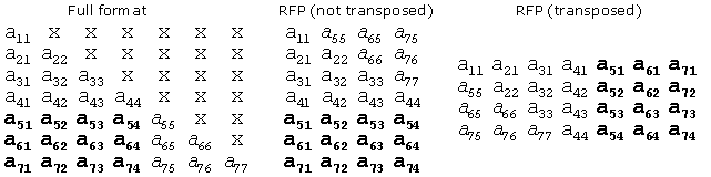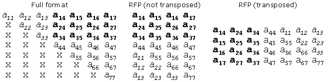 There are eight cases of RFP storage representation: when n is even or odd, the packed matrix is transposed or not, the triangular matrix is lower or upper. See below for all the eight storage schemes illustrated: