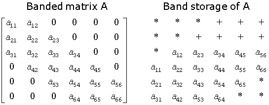 Band storage is as follows: an m-by-n band matrix with kl non-zero sub-diagonals and ku non-zero super-diagonals is stored compactly in a two-dimensional array ab with kl+ku + 1 rows and n columns. Columns of the matrix are stored in the corresponding columns of the array, and diagonals of the matrix are stored in rows of the array . Thus,