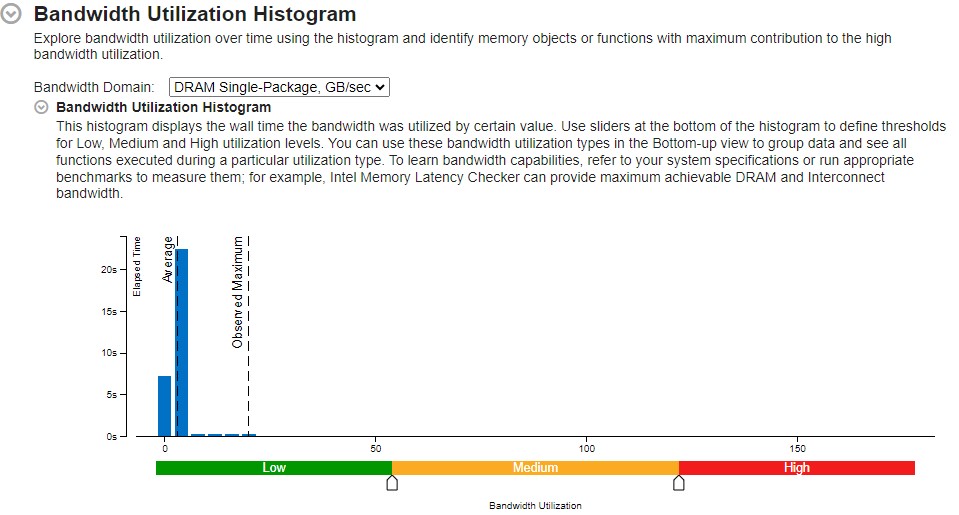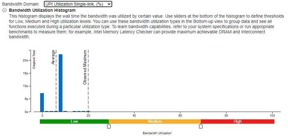 This histogram plots the system bandwidth (in this example, DRAM and UPI) used by a certain value on the X axis against time on the Y axis. The histogram provides thresholds to categorize bandwidth utilization as High, Medium, or Low. To set the threshold, move sliders at the bottom of the histogram. Here are examples for both bandwidth domains: