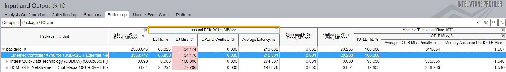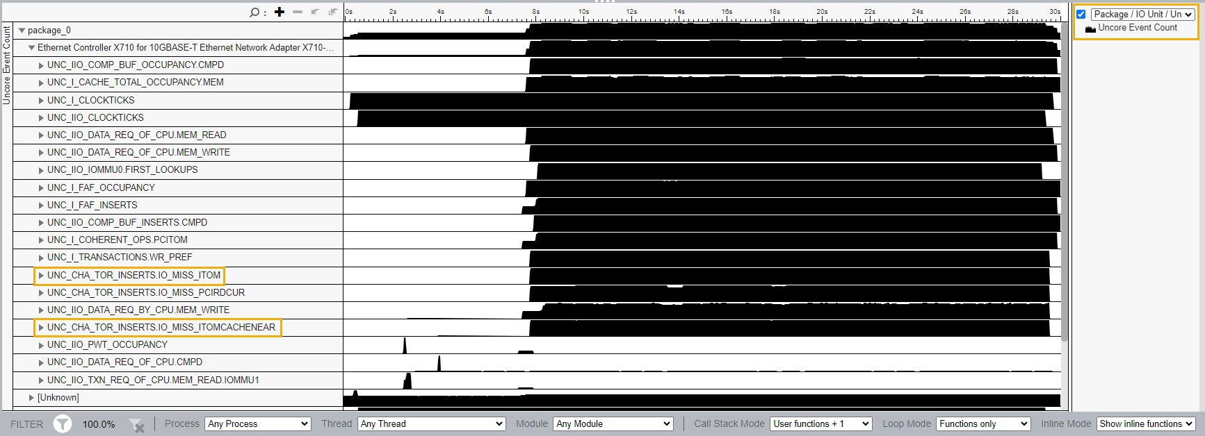 To see uncore events that are attributed a group of PCIe devices on each socket, in the right corner of the timeline section, select the Package/IO Unit/Uncore Event Short Name/Uncore Event Type grouping.