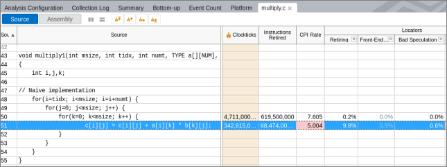 Double-clicking this function opens the Source view that highlights the most performance-critical code line: