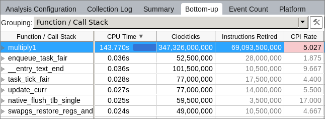 When you switch to the Bottom-up view, you see that the application has one big hotspot function multiply1: