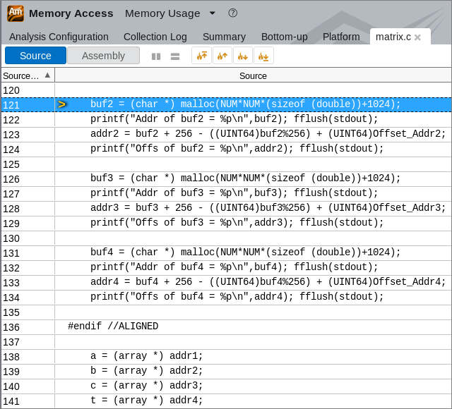 Click the first hotspot object matrix.c:121 in the list to switch to the Bottom-up view and then double-click this object highlighted in the grid to open the Source view and see the line allocating this memory object: