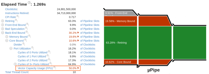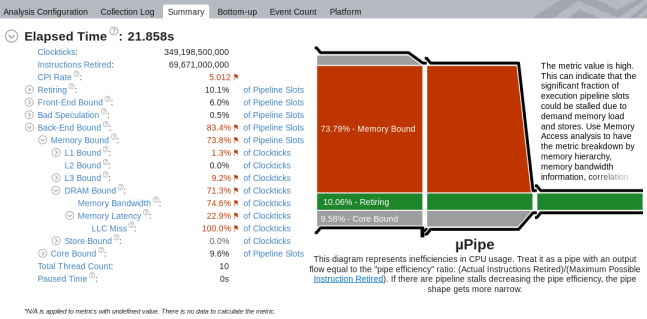 Microarchitecture Exploration helps you see dominant performance bottlenecks in your code. Start your analysis with the µPipe representation in the Summary view that displays CPU microarchitecture efficiency and CPU pipeline stalls for the analyzed application. According to the µPipe below, the output pipe flow is very narrow, which means that the Retiring metric value needs to be increased to improve application performance. The primary obstacle in the pipe is the Memory Bound metric value: