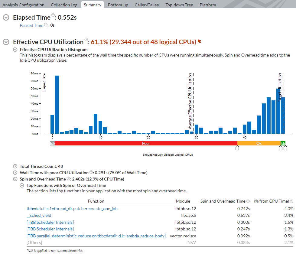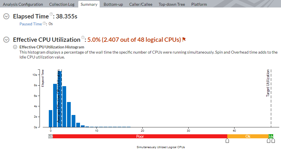 The Effective CPU Utilization Histogram shows that, on average, the application utilized only ~3 physical cores out of 48 available cores: