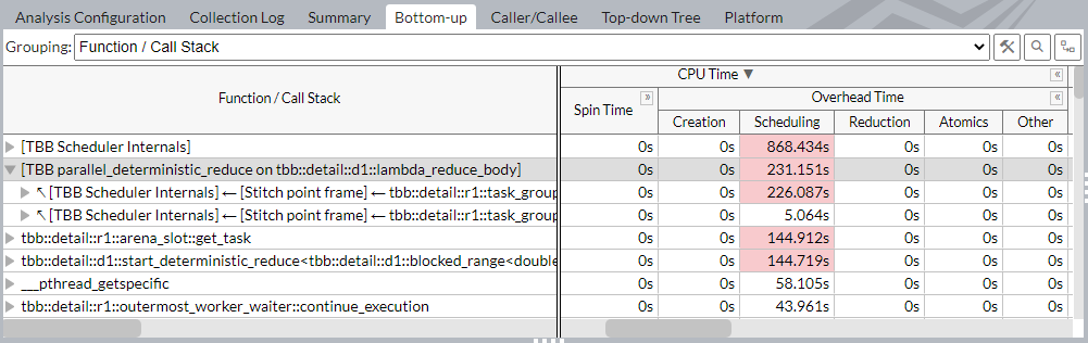 Expand the CPU Time > Overhead Time columns to sort the grid by the Scheduling column. Look at the first row with the oneTBB parallel construct in the Function list: