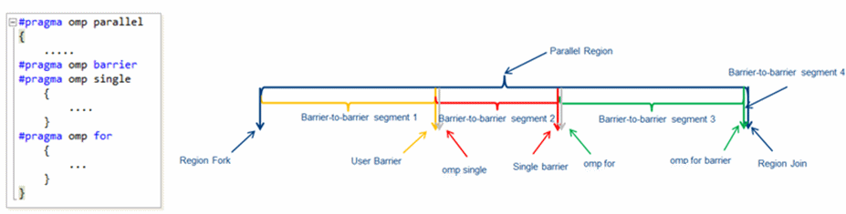 In the example above, there are four barrier-to-barrier segments defined as a user barrier, implicit single barrier, implicit omp for loop barrier and region join barrier.