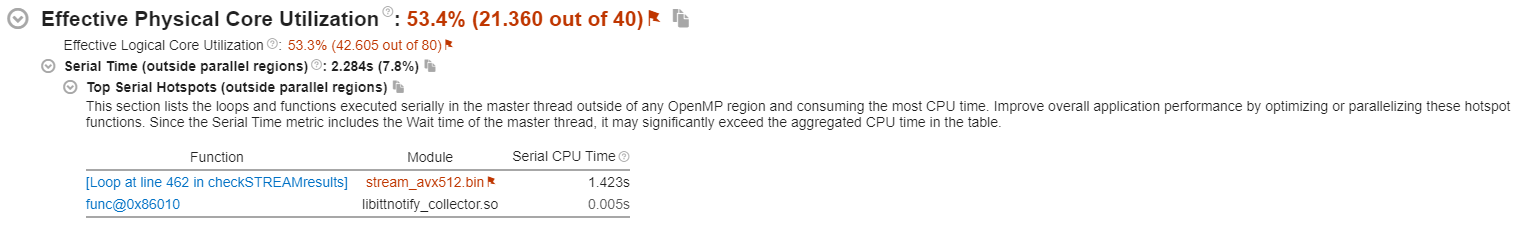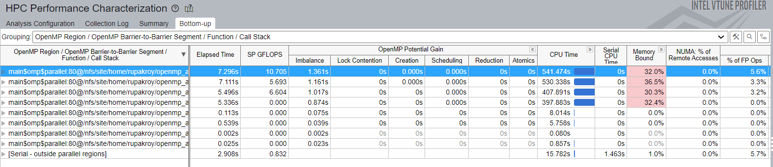 The OpenMP runtime library in the Intel Composer provides special markers for applications running under profiling that can be used by the VTune Profiler to decipher the statistics of OpenMP parallel regions and distinguish serial parts of the application code.