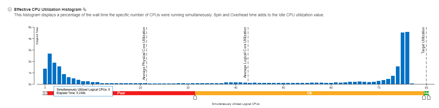 Other viewpoints provide the CPU Utilization Histogram that displays the Elapsed time of your application, broken down by CPU utilization levels. The histogram shows only useful utilization so the CPU cycles that were spent by the application burning CPU in spin loops (active wait) are not counted. You can adjust sliders from the default levels if you intentionally use a number of OpenMP working threads less than the number of available hardware threads.