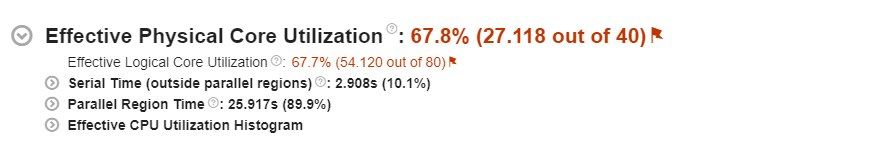 Start your analysis with understanding the CPU utilization of your analysis target. If you are using the HPC Performance Characterization viewpoint, focus on the Effective Physical Core Utilization section of the Summary window that shows the number of used logical and physical cores and estimates the efficiency (in percent) of this CPU utilization. Poor core utilization is flagged as a performance issue.