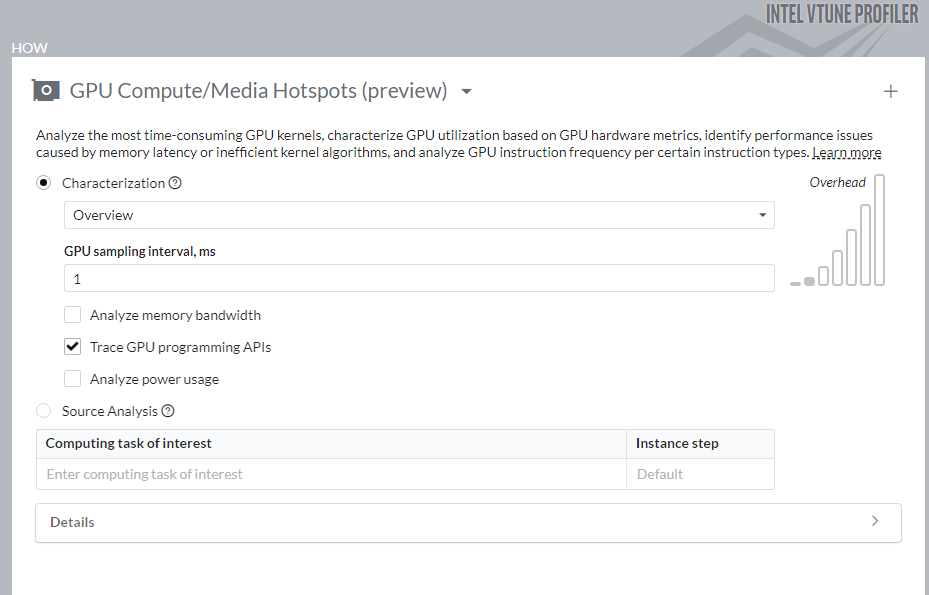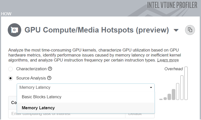 The default analysis configuration invokes the Characterization profile with the Overview metric set. In addition to individual compute task characterization that is available through the GPU Offload analysis, VTune Profiler provides memory bandwidth metrics that are categorized by different levels of GPU memory hierarchy.
