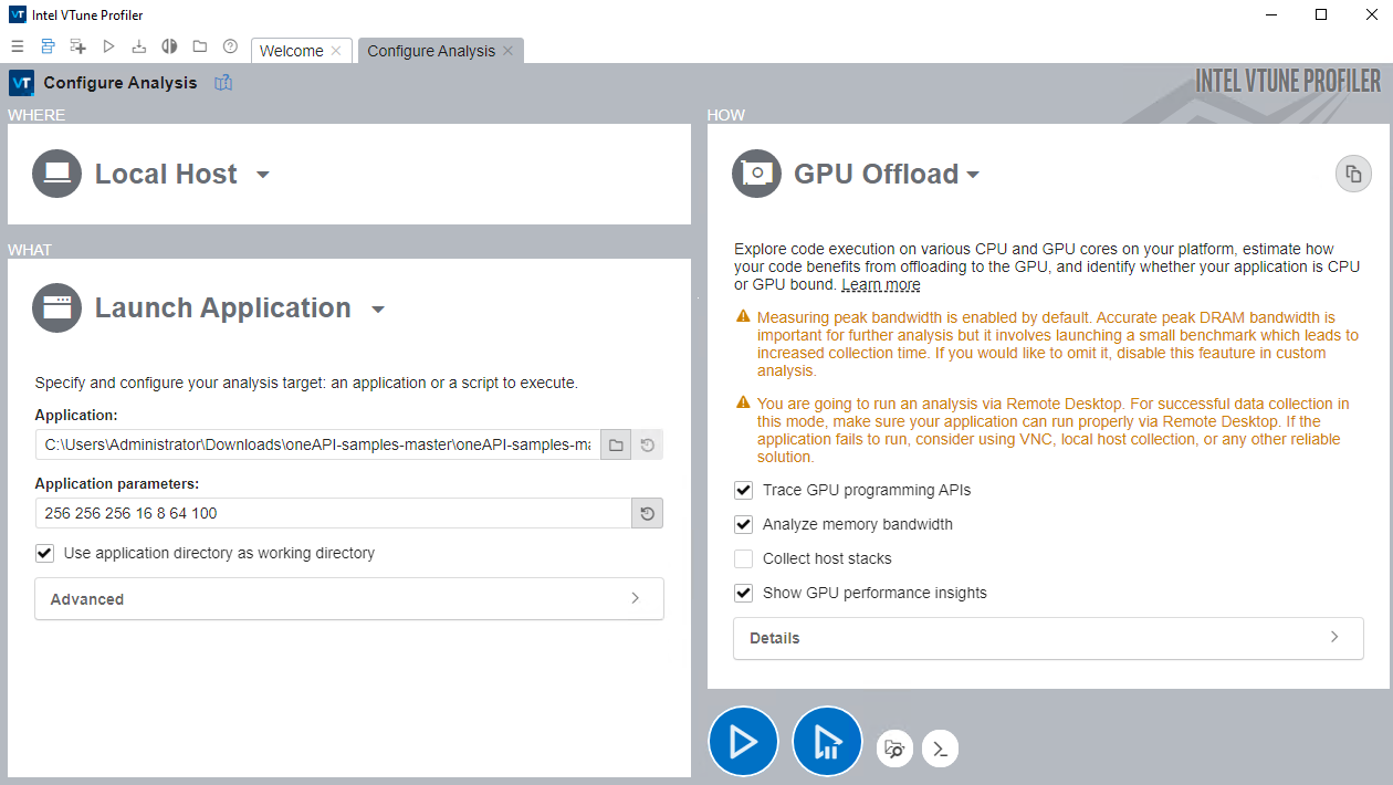 - In the WHAT pane, select Launch Application and specify the iso3dfd_omp_offload binary as the application to profile.