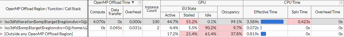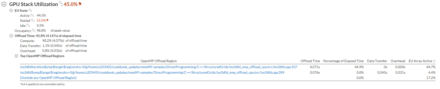 In the GPU Stack Utilization section, look at the top OpenMP offload regions sorted by offload time spent in those regions. You can see GPU utilization in each of these offload regions.