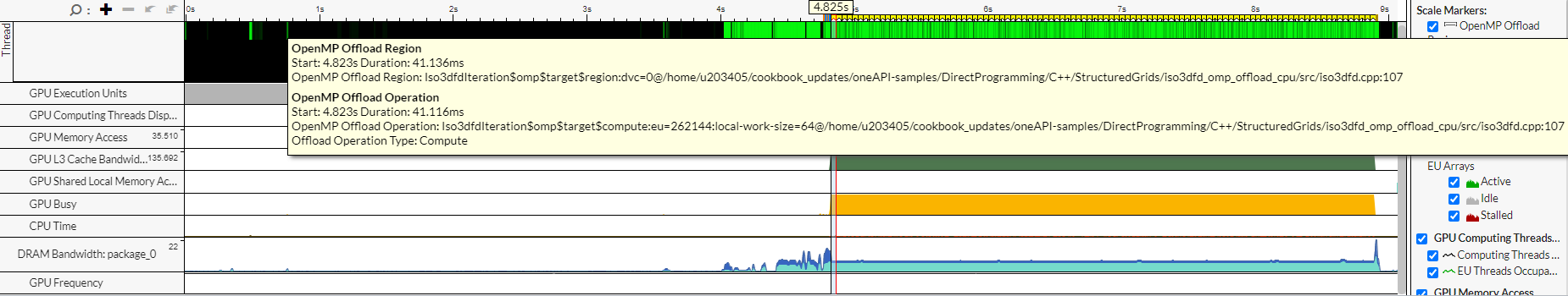 Hover over the region markers at the top of the timeline view. You can see the name and duration of each offload region and offload operation within that region. The GPU metrics in the timeline help you understand how every instance of an offload region behaves over time.