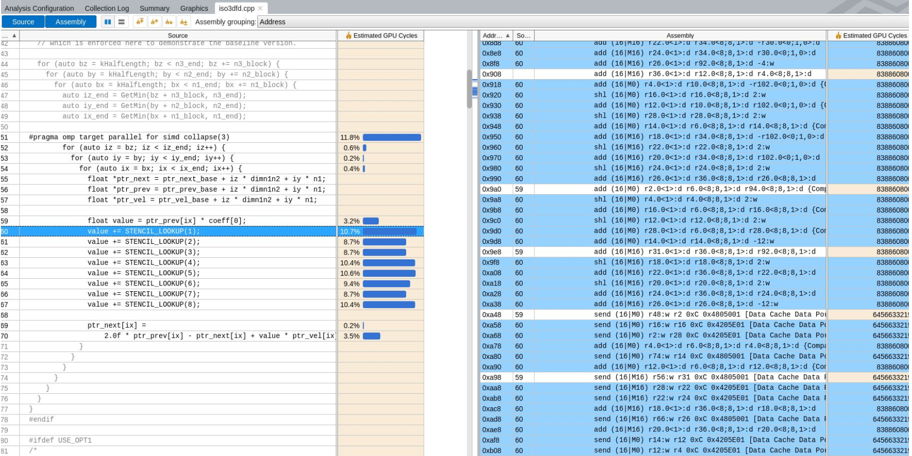 vtune -report hotspots -source-object 'computing-task=Iso3dfdIteration$omp$offloading:50' -group-by=gpu-source-line -r <result>