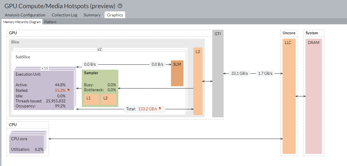 For a visual representation of the memory hierarchy, see the Memory Hierarchy Diagram. This diagram reflects the microarchitecture of the current GPU and shows memory bandwidth metrics. Use the diagram to understand the data traffic between memory units and execution units. You can also identify potential bottlenecks that cause EU stalls.