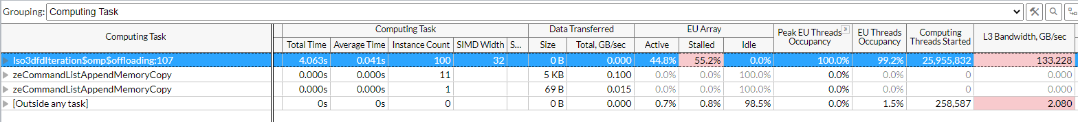 In this example, the offload activity is classified almost entirely as Compute activity. Also, a single offload region consumed the majority of offload time. Click on its name to switch to the Bottom-Up view. Examine the grouping table with OpenMP offload region durations, region instance counts, and metrics for GPU and CPU.