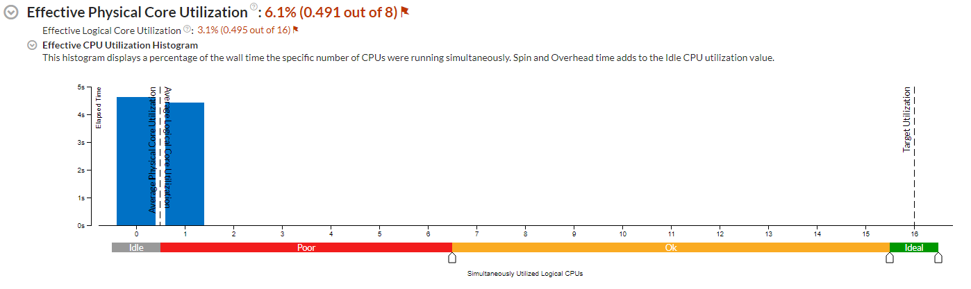 Start your analysis by examining the Summary pane. Look at the Effective Physical Core Utilization (or Effective Logical Core Utilization) and GPU Stack Utilization sections to see highlighted issues, if any.