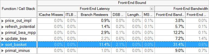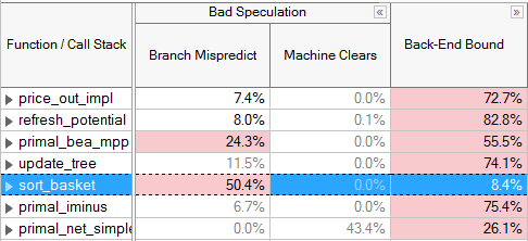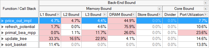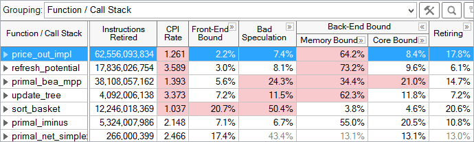 For each function, the fraction of pipeline slots in each category is shown. For example, the price_out_impl function, selected above, had 2.2% of its pipeline slots in the Front-End Bound category, 7.4% in Bad Speculation, 64.2% in Memory Bound, 8.4% in Core Bound, and 17.8% in the Retiring category. Each category can be expanded to view metrics underneath that category. Automatic highlighting is used to draw your attention to potential problem areas, in this case, to the high percentage of Memory Bound pipeline slots for price_out_impl.