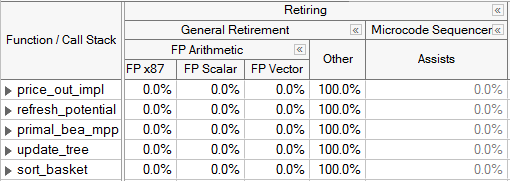 The last category at the top level is Retiring. It denotes when the pipeline is busy with typically useful operations. Ideally an application would have as many slots classified in this category as possible. However, even regions of code with a large portion of their pipeline slots retiring may have room for improvement. One performance issue that will fall under the retiring category is heavy use of the micro-sequencer, which assists the Front-end by generating a long stream of uops to address a particular condition. In this case, although there are many retiring uops, some of them could have been avoided. For example, FP Assists that apply in the event of Denormals can often be reduced through compiler options (like DAZ or FTZ). Code generation choices can also help mitigate these issues - for more details see the VTune Profiler tuning guides. In the Intel microarchitecture code name Sandy Bridge, Assists are identified as a metric under the Retiring category. In the Intel microarchitecture code name Ivy Bridge and beyond, the pipeline slots in the ideal category of retirement are broken into a sub-category called General Retirement, and Microcode Sequencer uops are identified separately.