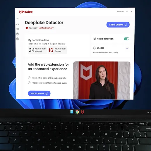 Receive instant alerts for AI-generated videos, helping you distinguish real from fake content. McAfee DeepFake Detector is available on all Intel® Core™ Ultra 200V series processor-based PCs.