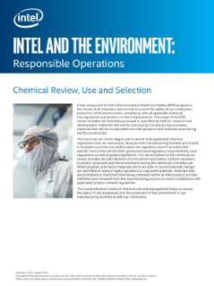 A key component of Intel’s Environmental Health and Safety (EHS) program is the review of all materials used at Intel to ensure the safety of our employees, protection of the environment, and compliance with all applicable chemical use regulations and product content requirements. The scope of the EHS review includes: all materials purchased or specified by Intel for research and development, materials that will be used during manufacturing processes, materials that will be incorporated into Intel® products, and materials used during facility construction.