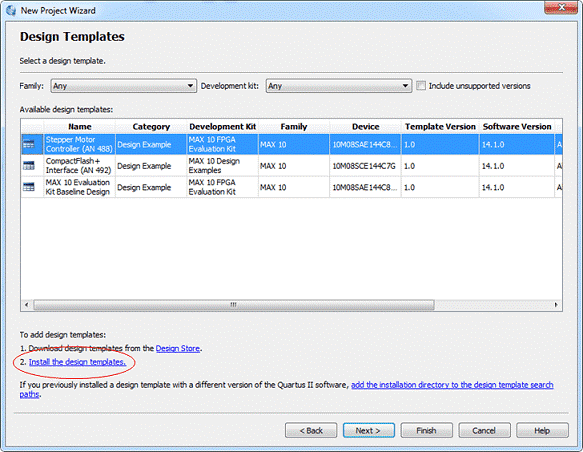 Note: The means to bring up the project template is through the New Project Wizard (File -> New Project Wizard). After entering the project name and folder on the first panel, the second panel will ask you to specify an empty project or project template. Select project template. You will see a list of Design Templates projects that you have loaded prior as well as various "Baseline Pinout Designs" that contain the pinout and settings for a variety of development kits. If you don't see your design template in the list, click on the link that states install the Design Templates circled below: