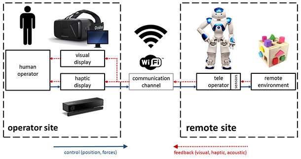 The human operator should actually be able to see the world through the eyes of the Nao robot including the field of view in 3D. This is realizable by using RGB stereo cameras. Using tactile sensors the robot is able to send touch events over the feedback communication channel to the human controller. So the controller can actually feel sensor based events occurring in the environment at the robot's site comparable to some kind of force-feedback.